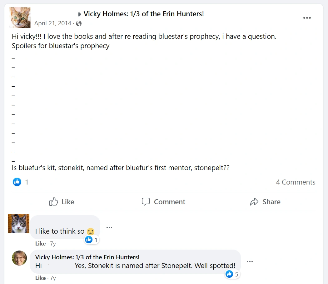- Hänet on listattu soturiksi novellin Täplälehden sydän hahmolistassa,[9] vaikka hänen pitäisi olla tuolloin jo eläköitynyt.[2]