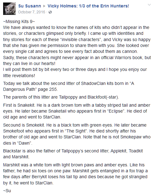 - Su Susannin "Missing Kits" -postauksissa Vickyn Facebookissa Käärmehäntä ja Savujalka olivat Mustatähden ja Unikonvarren pentuja, jotka syntyivät kirjassa Vaarallinen polku. Mustatähti oli myös isä Unikonvarren toiselle pentueelle, Omenaturkille, Konnajalalle ja Suopennulle.[5] Konnajalalla on myös meripihkanväriset silmät.[6]