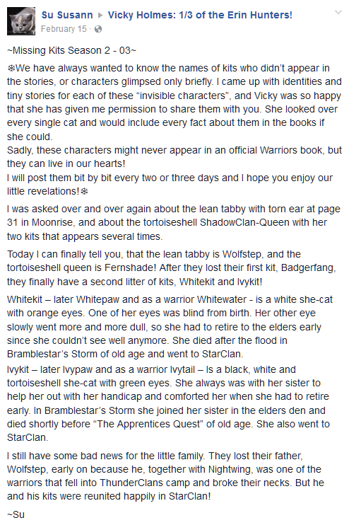 - Su Susannin "Missing Kits" -postauksissa Vickyn Facebookissa Murattihäntä ja Valkovesi ovat Susiaskelen ja Lehvävarjon tyttäriä. Häntä kuvailtiin vihreäsilmäisenä, ja hän kuoli vähän aikaa ennen kirjaa Oppilaan tehtävä ja liittyi Tähtiklaaniin.[8]