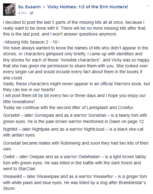 - Su Susannin "Missing Kits" -postauksissa Vickyn Facebookissa Seittijalka ja Valkohäntä olivat Varisturkin ja Kiurutäplän pentuja.[11] Hänen nuoremmat sisaruksensa olivat Yöpilvi ja Piikkihernehäntä.[12] Seittijalkaa kuvailtiin keltasilmäisenä.[11]